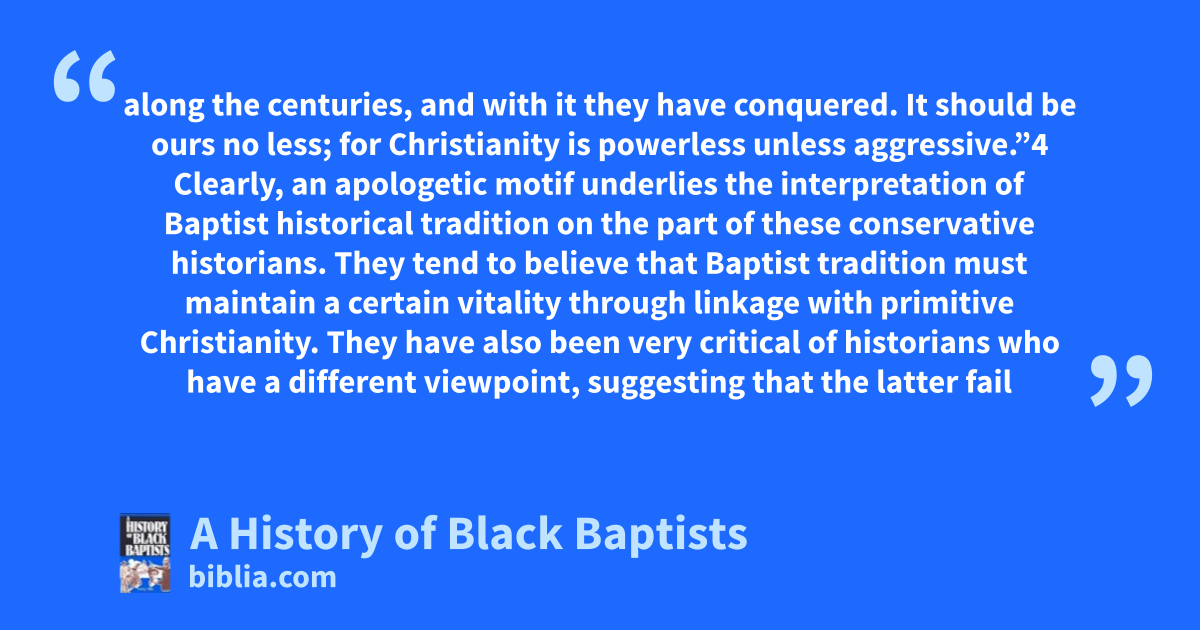 along the centuries, and with it they have conquered. It should be ours no less; for Christianity is powerless unless aggressive.”4 Clearly, an apologetic motif underlies the interpretation of Baptist historical tradition on the part of these conservative historians. They tend to believe that Baptist tradition must maintain a certain vitality through linkage with primitive Christianity. They have also been very critical of historians who have a different viewpoint, suggesting that the latter fail