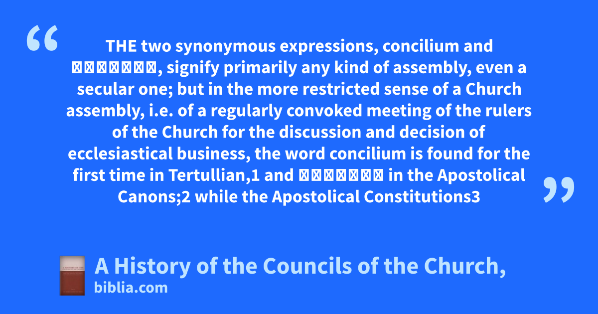 THE two synonymous expressions, concilium and σύνοδος, signify primarily any kind of assembly, even a secular one; but in the more restricted sense of a Church assembly, i.e. of a regularly convoked meeting of the rulers of the Church for the discussion and decision of ecclesiastical business, the word concilium is found for the first time in Tertullian,1 and σύνοδος in the Apostolical Canons;2 while the Apostolical Constitutions3