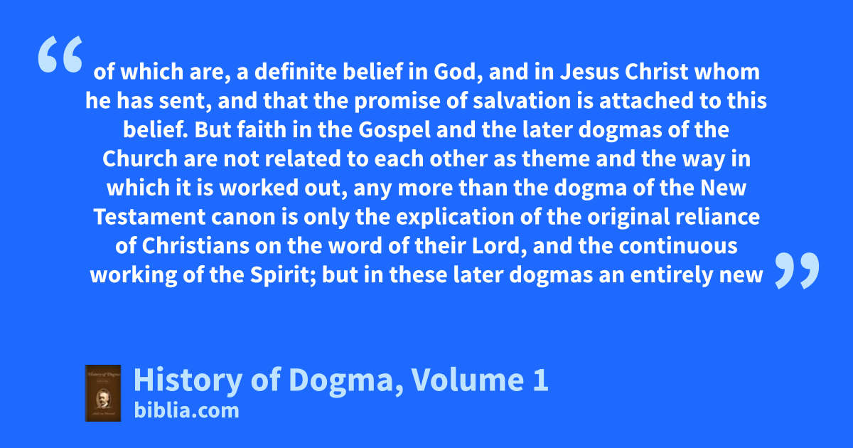 of which are, a definite belief in God, and in Jesus Christ whom he has sent, and that the promise of salvation is attached to this belief. But faith in the Gospel and the later dogmas of the Church are not related to each other as theme and the way in which it is worked out, any more than the dogma of the New Testament canon is only the explication of the original reliance of Christians on the word of their Lord, and the continuous working of the Spirit; but in these later dogmas an entirely new