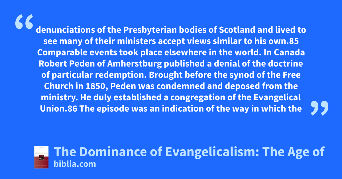 denunciations of the Presbyterian bodies of Scotland and lived to see many of their ministers accept views similar to his own.85 Comparable events took place elsewhere in the world. In Canada Robert Peden of Amherstburg published a denial of the doctrine of particular redemption. Brought before the synod of the Free Church in 1850, Peden was condemned and deposed from the ministry. He duly established a congregation of the Evangelical Union.86 The episode was an indication of the way in which the