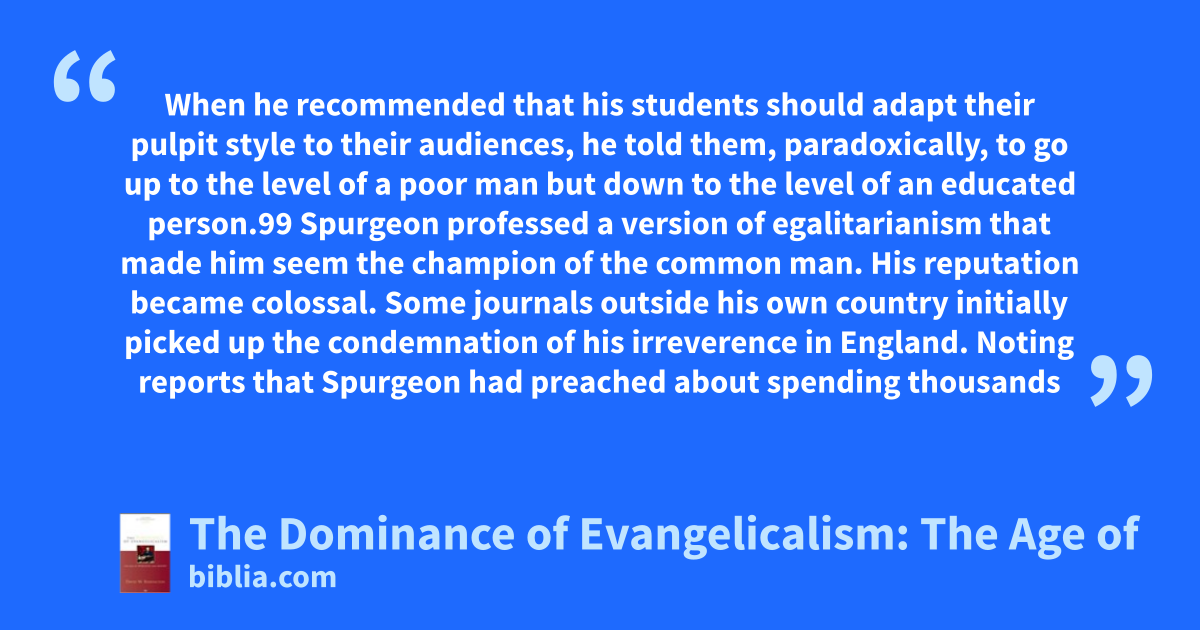 When he recommended that his students should adapt their pulpit style to their audiences, he told them, paradoxically, to go up to the level of a poor man but down to the level of an educated person.99 Spurgeon professed a version of egalitarianism that made him seem the champion of the common man. His reputation became colossal. Some journals outside his own country initially picked up the condemnation of his irreverence in England. Noting reports that Spurgeon had preached about spending thousands