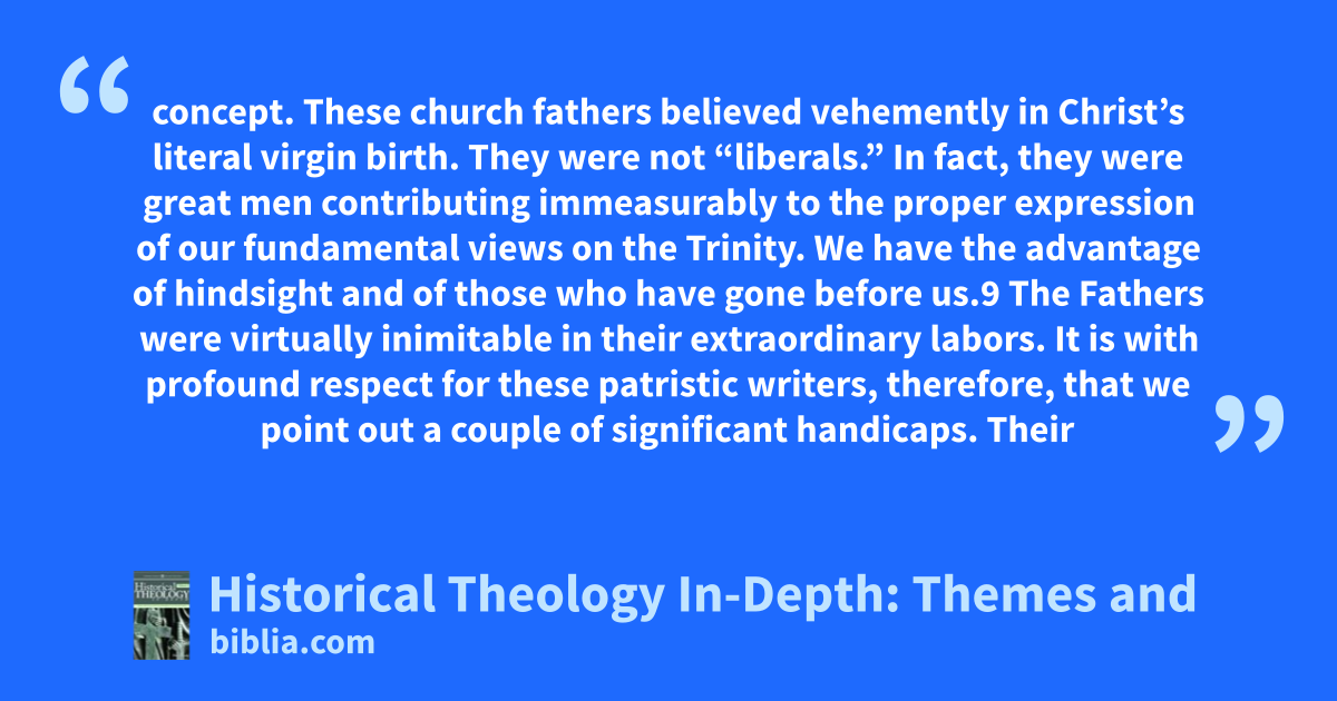 concept. These church fathers believed vehemently in Christ’s literal virgin birth. They were not “liberals.” In fact, they were great men contributing immeasurably to the proper expression of our fundamental views on the Trinity. We have the advantage of hindsight and of those who have gone before us.9 The Fathers were virtually inimitable in their extraordinary labors. It is with profound respect for these patristic writers, therefore, that we point out a couple of significant handicaps. Their