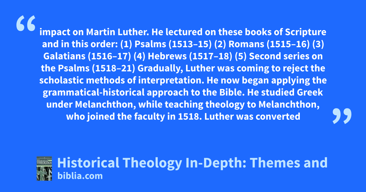 impact on Martin Luther. He lectured on these books of Scripture and in this order: (1) Psalms (1513–15) (2) Romans (1515–16) (3) Galatians (1516–17) (4) Hebrews (1517–18) (5) Second series on the Psalms (1518–21) Gradually, Luther was coming to reject the scholastic methods of interpretation. He now began applying the grammatical-historical approach to the Bible. He studied Greek under Melanchthon, while teaching theology to Melanchthon, who joined the faculty in 1518. Luther was converted