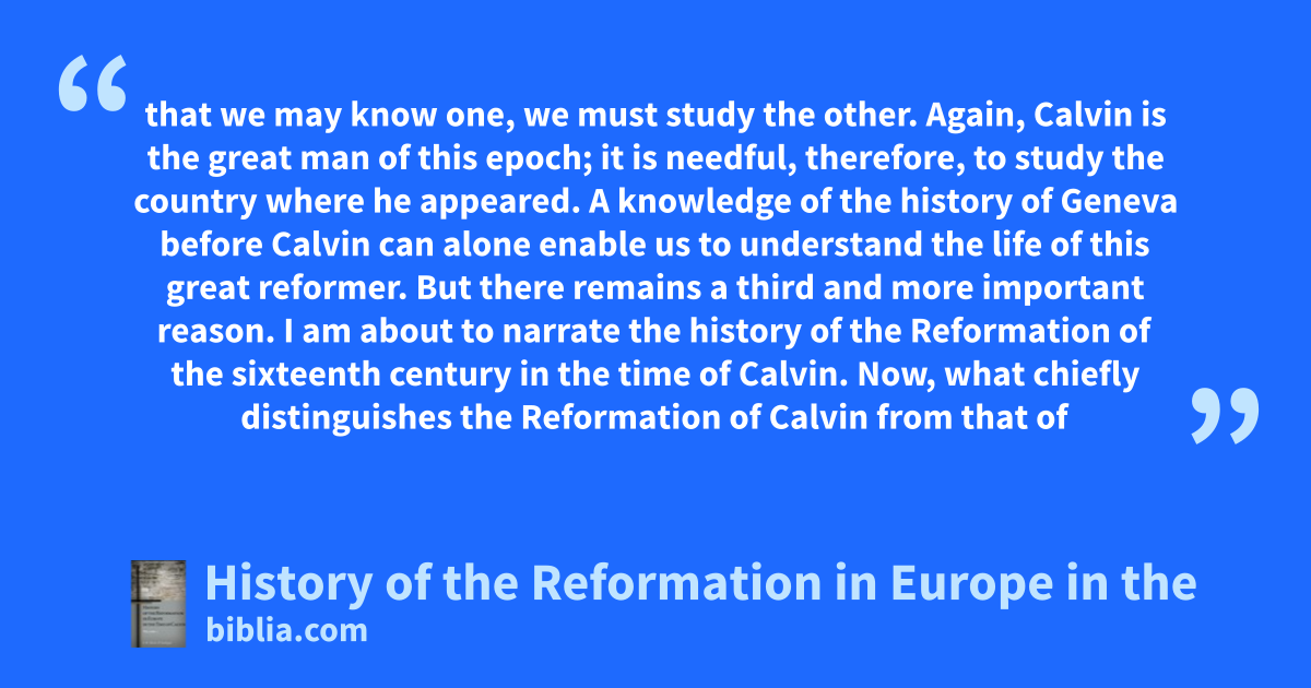 that we may know one, we must study the other. Again, Calvin is the great man of this epoch; it is needful, therefore, to study the country where he appeared. A knowledge of the history of Geneva before Calvin can alone enable us to understand the life of this great reformer. But there remains a third and more important reason. I am about to narrate the history of the Reformation of the sixteenth century in the time of Calvin. Now, what chiefly distinguishes the Reformation of Calvin from that of