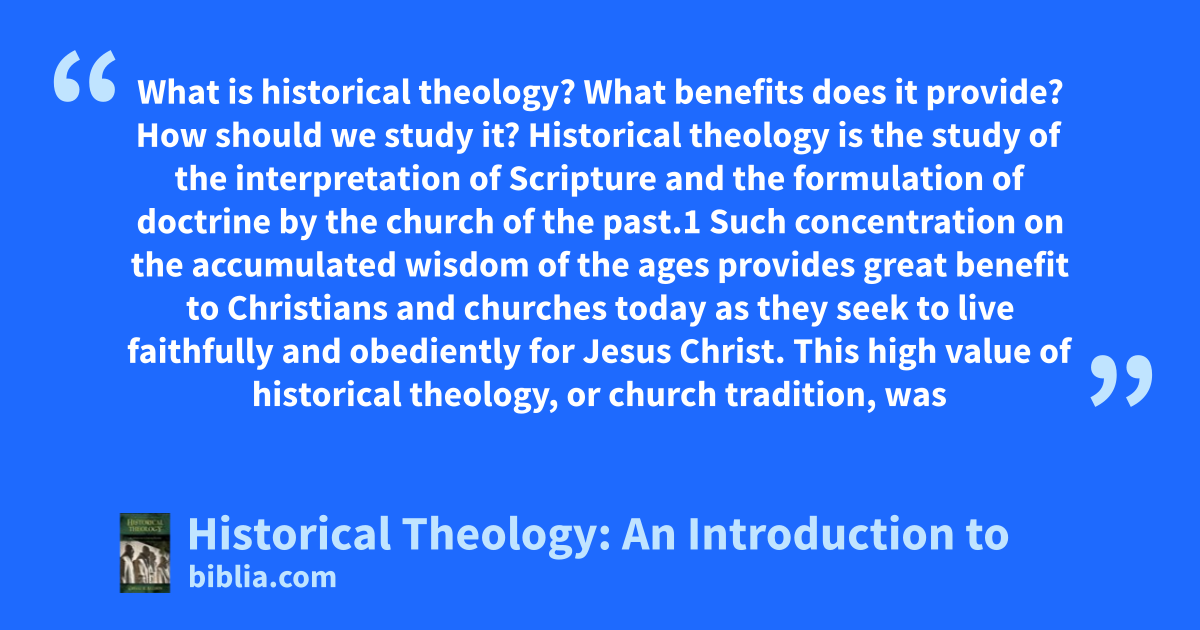 What is historical theology? What benefits does it provide? How should we study it? Historical theology is the study of the interpretation of Scripture and the formulation of doctrine by the church of the past.1 Such concentration on the accumulated wisdom of the ages provides great benefit to Christians and churches today as they seek to live faithfully and obediently for Jesus Christ. This high value of historical theology, or church tradition, was
