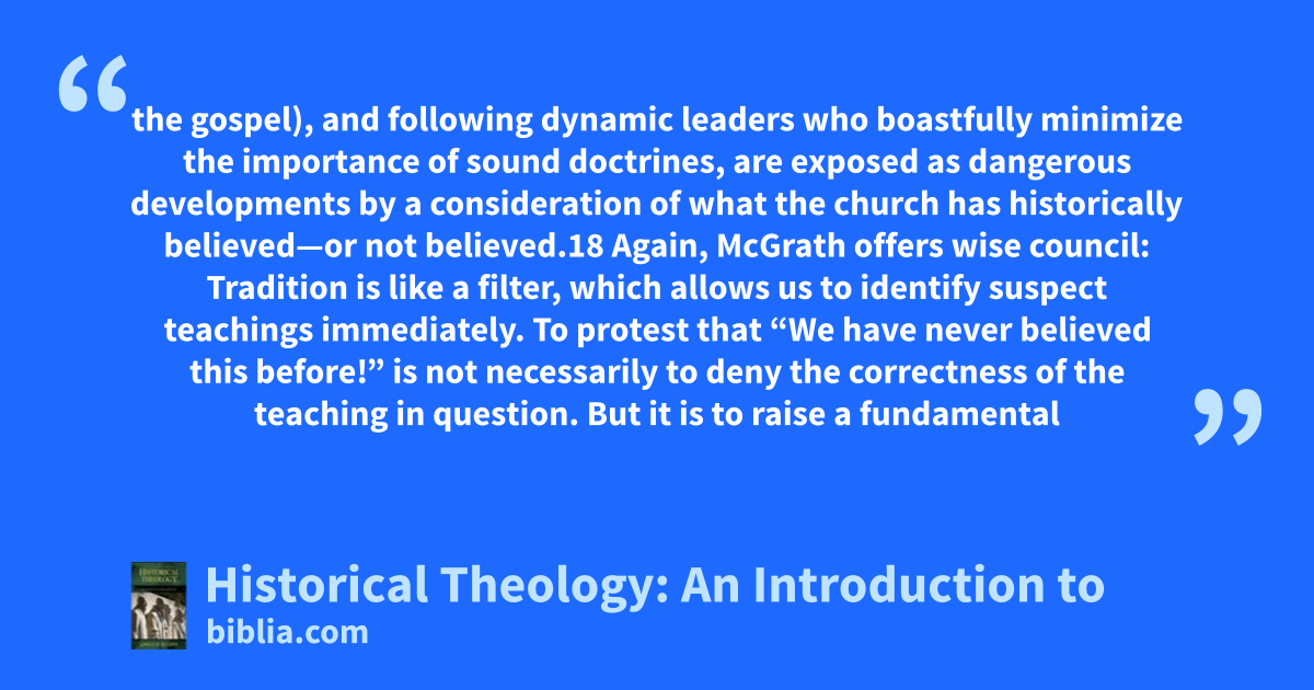 the gospel), and following dynamic leaders who boastfully minimize the importance of sound doctrines, are exposed as dangerous developments by a consideration of what the church has historically believed—or not believed.18 Again, McGrath offers wise council: Tradition is like a filter, which allows us to identify suspect teachings immediately. To protest that “We have never believed this before!” is not necessarily to deny the correctness of the teaching in question. But it is to raise a fundamental