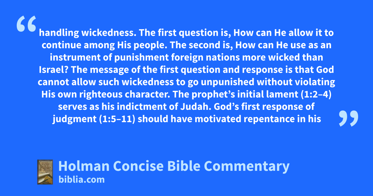 handling wickedness. The first question is, How can He allow it to continue among His people. The second is, How can He use as an instrument of punishment foreign nations more wicked than Israel? The message of the first question and response is that God cannot allow such wickedness to go unpunished without violating His own righteous character. The prophet’s initial lament (1:2–4) serves as his indictment of Judah. God’s first response of judgment (1:5–11) should have motivated repentance in his