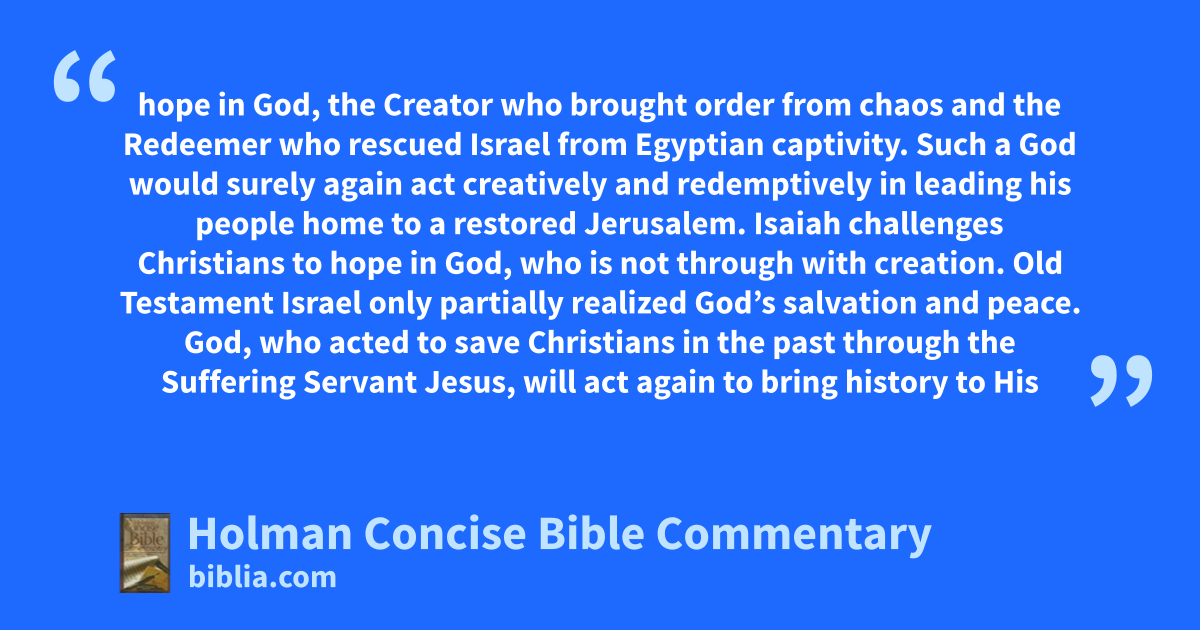 hope in God, the Creator who brought order from chaos and the Redeemer who rescued Israel from Egyptian captivity. Such a God would surely again act creatively and redemptively in leading his people home to a restored Jerusalem. Isaiah challenges Christians to hope in God, who is not through with creation. Old Testament Israel only partially realized God’s salvation and peace. God, who acted to save Christians in the past through the Suffering Servant Jesus, will act again to bring history to His