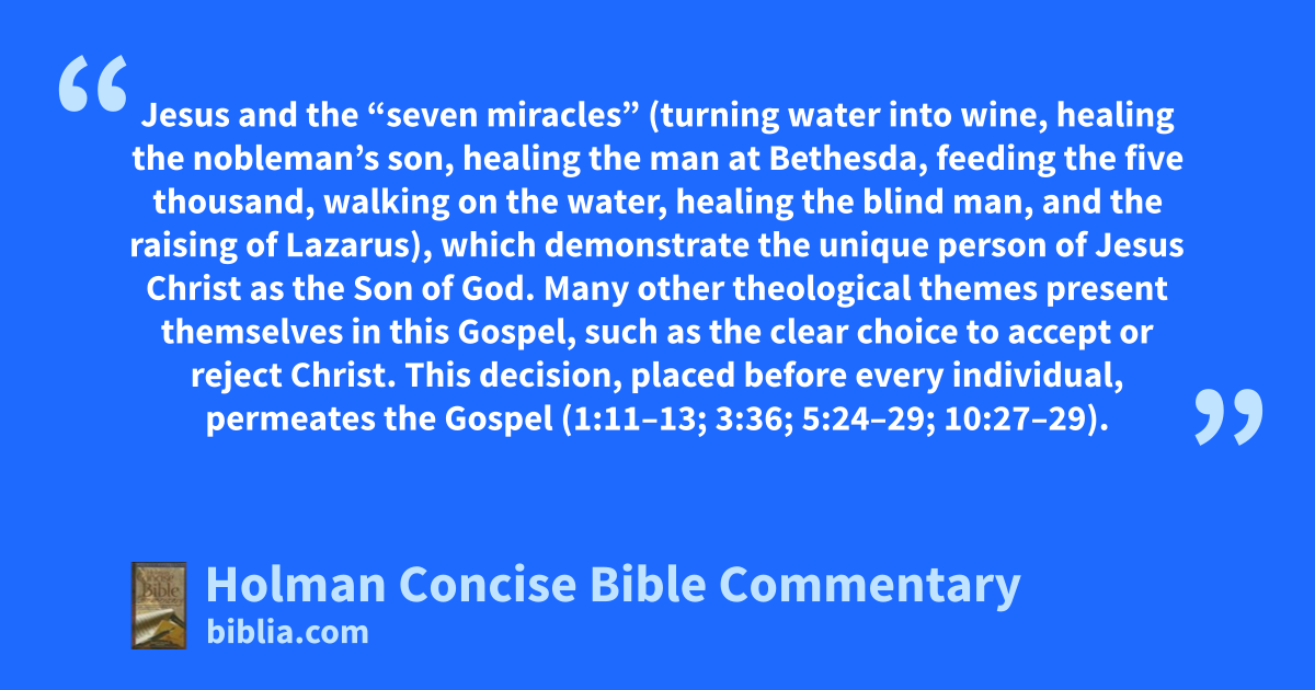 Jesus and the “seven miracles” (turning water into wine, healing the nobleman’s son, healing the man at Bethesda, feeding the five thousand, walking on the water, healing the blind man, and the raising of Lazarus), which demonstrate the unique person of Jesus Christ as the Son of God. Many other theological themes present themselves in this Gospel, such as the clear choice to accept or reject Christ. This decision, placed before every individual, permeates the Gospel (1:11–13; 3:36; 5:24–29; 10:27–29).