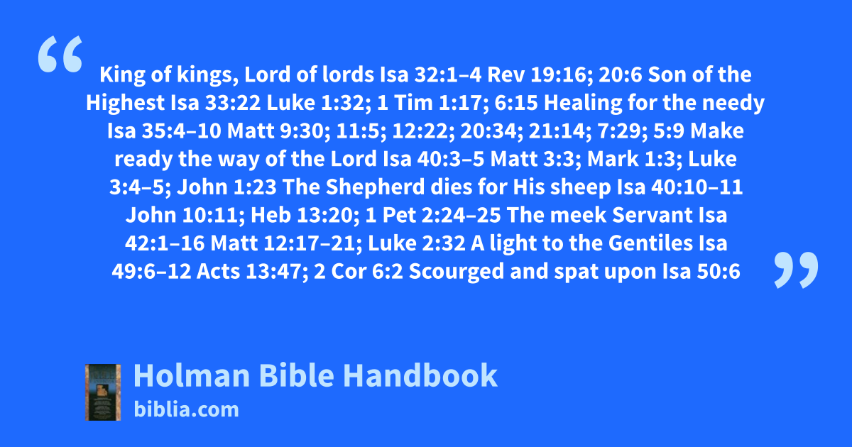 King of kings, Lord of lords Isa 32:1–4 Rev 19:16; 20:6 Son of the Highest Isa 33:22 Luke 1:32; 1 Tim 1:17; 6:15 Healing for the needy Isa 35:4–10 Matt 9:30; 11:5; 12:22; 20:34; 21:14; 7:29; 5:9 Make ready the way of the Lord Isa 40:3–5 Matt 3:3; Mark 1:3; Luke 3:4–5; John 1:23 The Shepherd dies for His sheep Isa 40:10–11 John 10:11; Heb 13:20; 1 Pet 2:24–25 The meek Servant Isa 42:1–16 Matt 12:17–21; Luke 2:32 A light to the Gentiles Isa 49:6–12 Acts 13:47; 2 Cor 6:2 Scourged and spat upon Isa 50:6