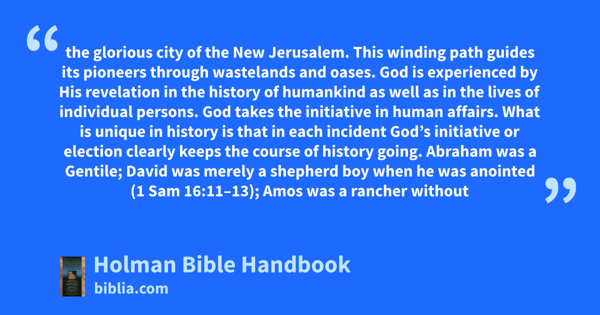 the glorious city of the New Jerusalem. This winding path guides its pioneers through wastelands and oases. God is experienced by His revelation in the history of humankind as well as in the lives of individual persons. God takes the initiative in human affairs. What is unique in history is that in each incident God’s initiative or election clearly keeps the course of history going. Abraham was a Gentile; David was merely a shepherd boy when he was anointed (1 Sam 16:11–13); Amos was a rancher without