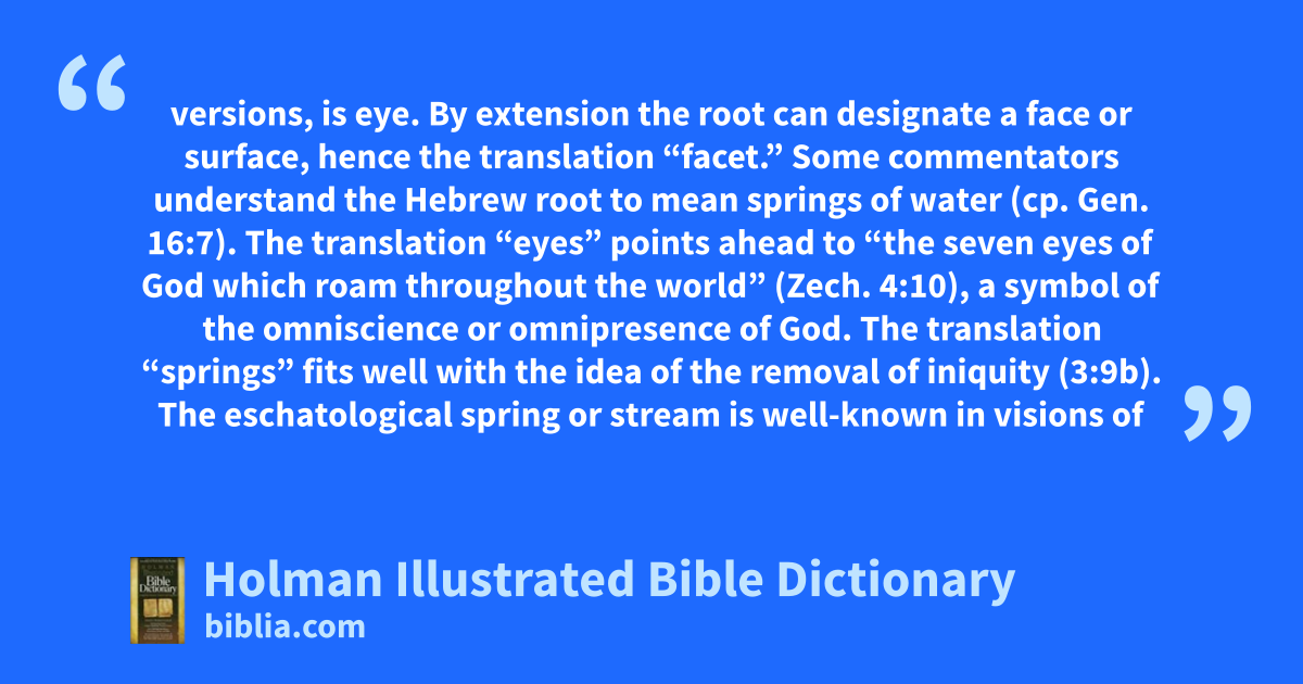 versions, is eye. By extension the root can designate a face or surface, hence the translation “facet.” Some commentators understand the Hebrew root to mean springs of water (cp. Gen. 16:7). The translation “eyes” points ahead to “the seven eyes of God which roam throughout the world” (Zech. 4:10), a symbol of the omniscience or omnipresence of God. The translation “springs” fits well with the idea of the removal of iniquity (3:9b). The eschatological spring or stream is well-known in visions of