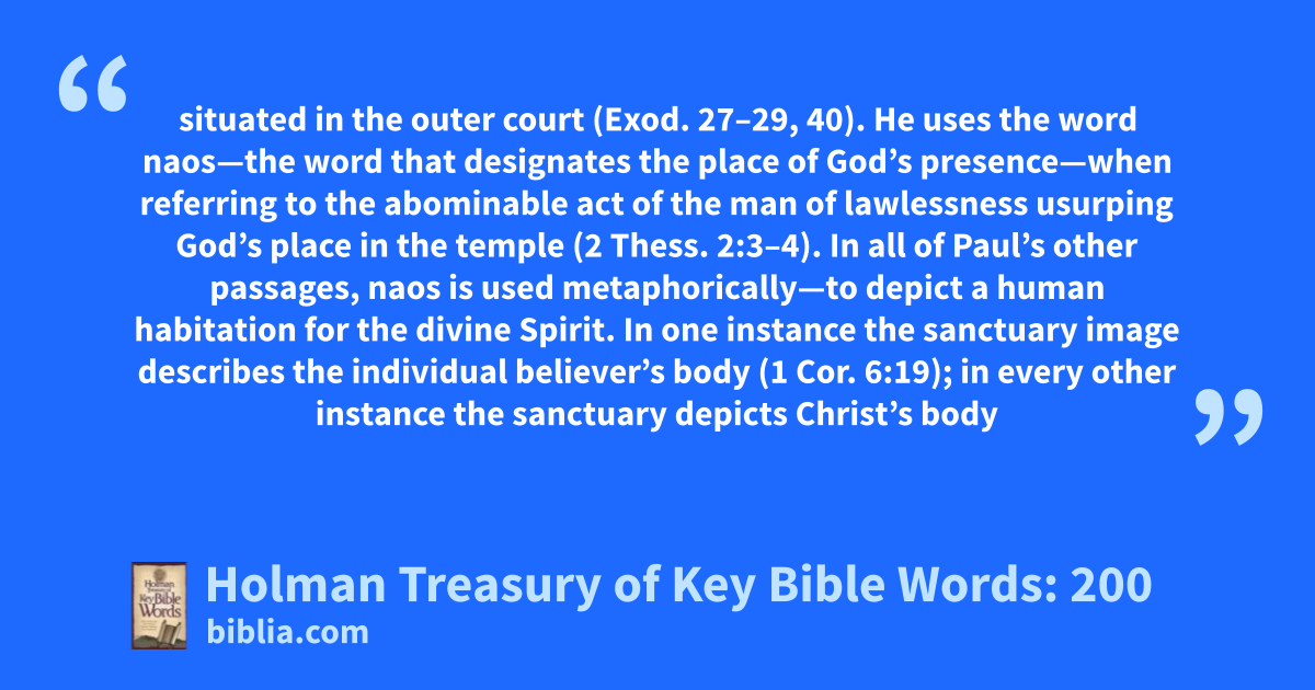 situated in the outer court (Exod. 27–29, 40). He uses the word naos—the word that designates the place of God’s presence—when referring to the abominable act of the man of lawlessness usurping God’s place in the temple (2 Thess. 2:3–4). In all of Paul’s other passages, naos is used metaphorically—to depict a human habitation for the divine Spirit. In one instance the sanctuary image describes the individual believer’s body (1 Cor. 6:19); in every other instance the sanctuary depicts Christ’s body