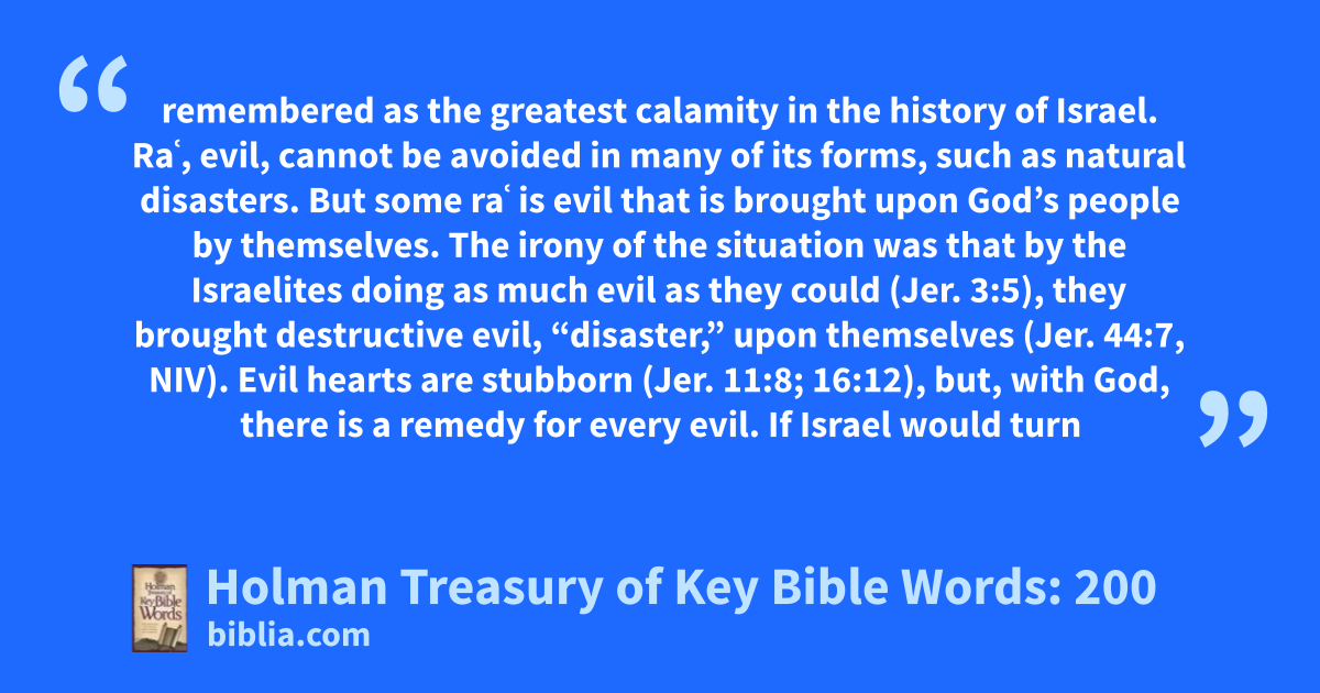 remembered as the greatest calamity in the history of Israel. Raʿ, evil, cannot be avoided in many of its forms, such as natural disasters. But some raʿ is evil that is brought upon God’s people by themselves. The irony of the situation was that by the Israelites doing as much evil as they could (Jer. 3:5), they brought destructive evil, “disaster,” upon themselves (Jer. 44:7, NIV). Evil hearts are stubborn (Jer. 11:8; 16:12), but, with God, there is a remedy for every evil. If Israel would turn