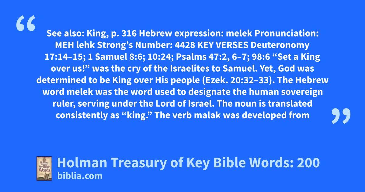 See also: King, p. 316 Hebrew expression: melek Pronunciation: MEH lehk Strong’s Number: 4428 KEY VERSES Deuteronomy 17:14–15; 1 Samuel 8:6; 10:24; Psalms 47:2, 6–7; 98:6 “Set a King over us!” was the cry of the Israelites to Samuel. Yet, God was determined to be King over His people (Ezek. 20:32–33). The Hebrew word melek was the word used to designate the human sovereign ruler, serving under the Lord of Israel. The noun is translated consistently as “king.” The verb malak was developed from