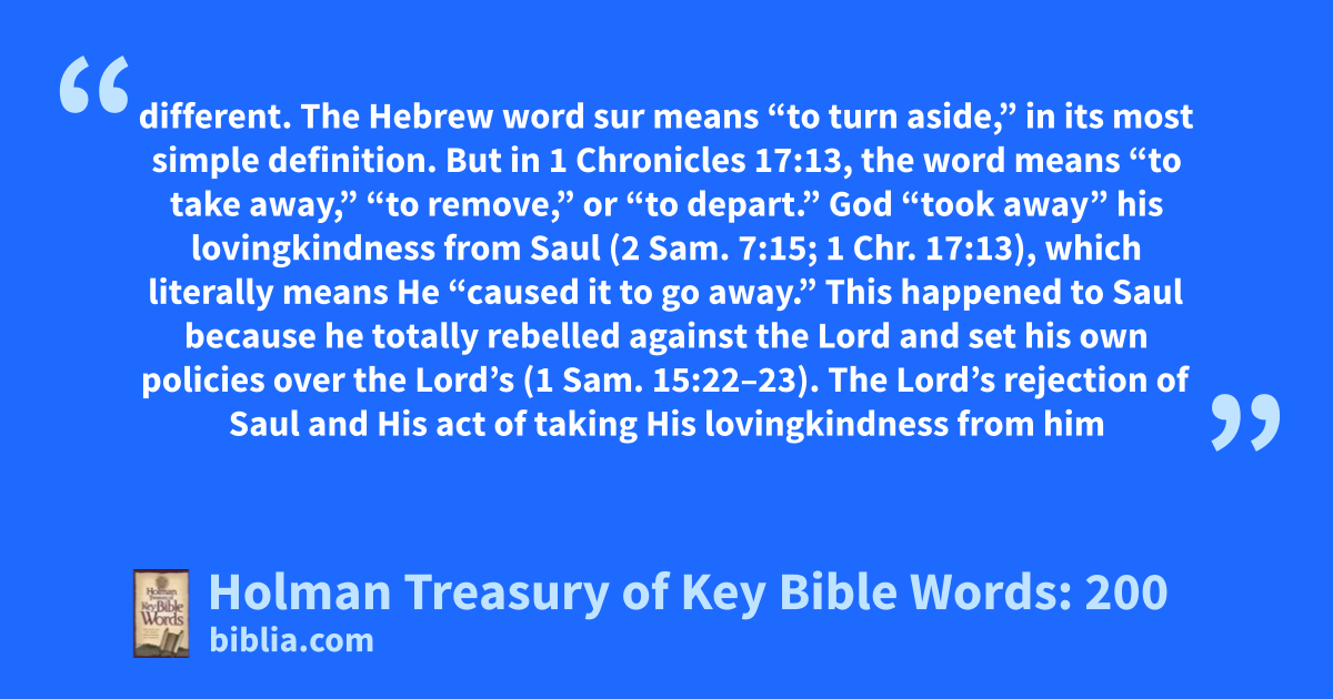 different. The Hebrew word sur means “to turn aside,” in its most simple definition. But in 1 Chronicles 17:13, the word means “to take away,” “to remove,” or “to depart.” God “took away” his lovingkindness from Saul (2 Sam. 7:15; 1 Chr. 17:13), which literally means He “caused it to go away.” This happened to Saul because he totally rebelled against the Lord and set his own policies over the Lord’s (1 Sam. 15:22–23). The Lord’s rejection of Saul and His act of taking His lovingkindness from him