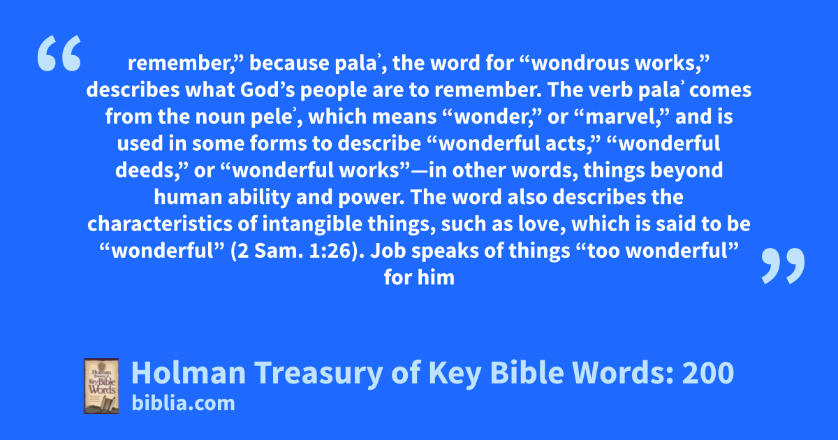 remember,” because palaʾ, the word for “wondrous works,” describes what God’s people are to remember. The verb palaʾ comes from the noun peleʾ, which means “wonder,” or “marvel,” and is used in some forms to describe “wonderful acts,” “wonderful deeds,” or “wonderful works”—in other words, things beyond human ability and power. The word also describes the characteristics of intangible things, such as love, which is said to be “wonderful” (2 Sam. 1:26). Job speaks of things “too wonderful” for him