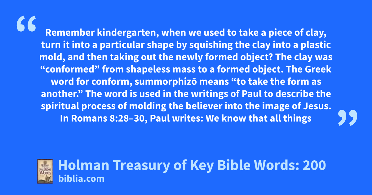 Remember kindergarten, when we used to take a piece of clay, turn it into a particular shape by squishing the clay into a plastic mold, and then taking out the newly formed object? The clay was “conformed” from shapeless mass to a formed object. The Greek word for conform, summorphizō means “to take the form as another.” The word is used in the writings of Paul to describe the spiritual process of molding the believer into the image of Jesus. In Romans 8:28–30, Paul writes: We know that all things