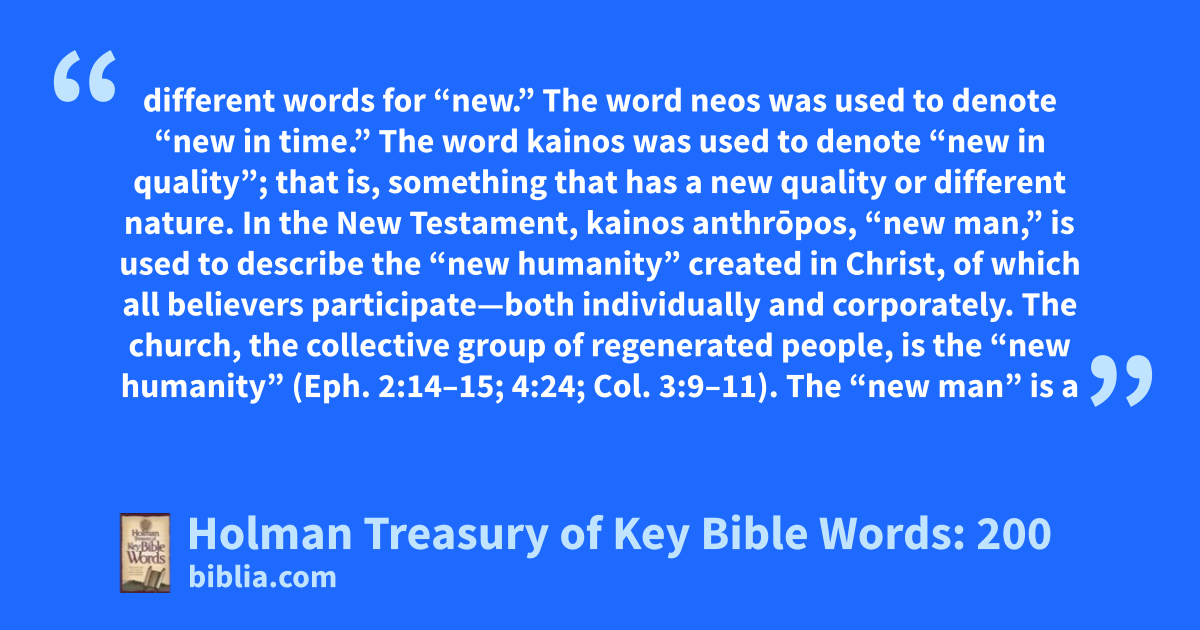 different words for “new.” The word neos was used to denote “new in time.” The word kainos was used to denote “new in quality”; that is, something that has a new quality or different nature. In the New Testament, kainos anthrōpos, “new man,” is used to describe the “new humanity” created in Christ, of which all believers participate—both individually and corporately. The church, the collective group of regenerated people, is the “new humanity” (Eph. 2:14–15; 4:24; Col. 3:9–11). The “new man” is a