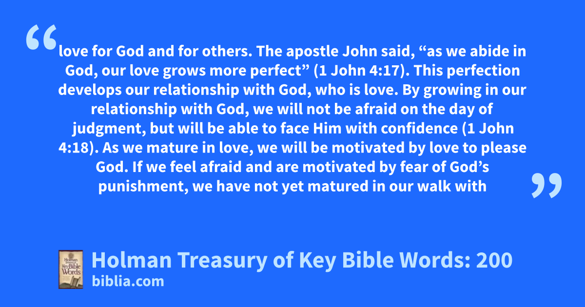 love for God and for others. The apostle John said, “as we abide in God, our love grows more perfect” (1 John 4:17). This perfection develops our relationship with God, who is love. By growing in our relationship with God, we will not be afraid on the day of judgment, but will be able to face Him with confidence (1 John 4:18). As we mature in love, we will be motivated by love to please God. If we feel afraid and are motivated by fear of God’s punishment, we have not yet matured in our walk with