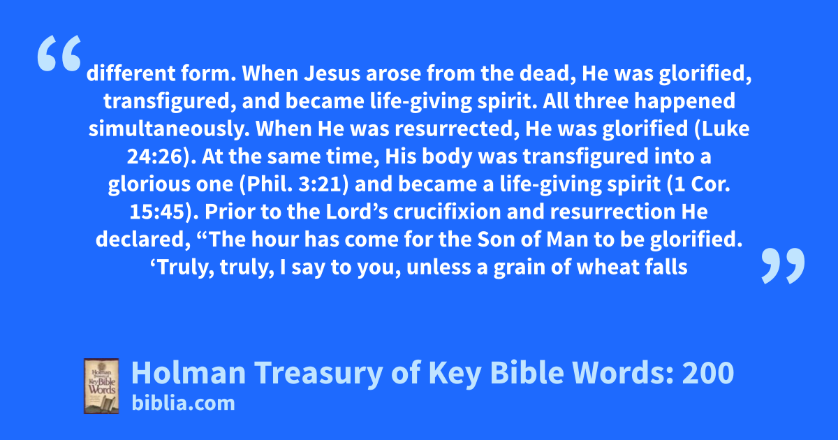 different form. When Jesus arose from the dead, He was glorified, transfigured, and became life-giving spirit. All three happened simultaneously. When He was resurrected, He was glorified (Luke 24:26). At the same time, His body was transfigured into a glorious one (Phil. 3:21) and became a life-giving spirit (1 Cor. 15:45). Prior to the Lord’s crucifixion and resurrection He declared, “The hour has come for the Son of Man to be glorified. ‘Truly, truly, I say to you, unless a grain of wheat falls
