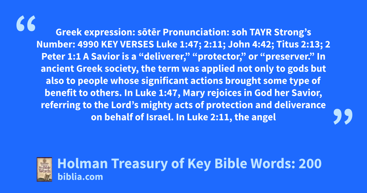Greek expression: sōtēr Pronunciation: soh TAYR Strong’s Number: 4990 KEY VERSES Luke 1:47; 2:11; John 4:42; Titus 2:13; 2 Peter 1:1 A Savior is a “deliverer,” “protector,” or “preserver.” In ancient Greek society, the term was applied not only to gods but also to people whose significant actions brought some type of benefit to others. In Luke 1:47, Mary rejoices in God her Savior, referring to the Lord’s mighty acts of protection and deliverance on behalf of Israel. In Luke 2:11, the angel