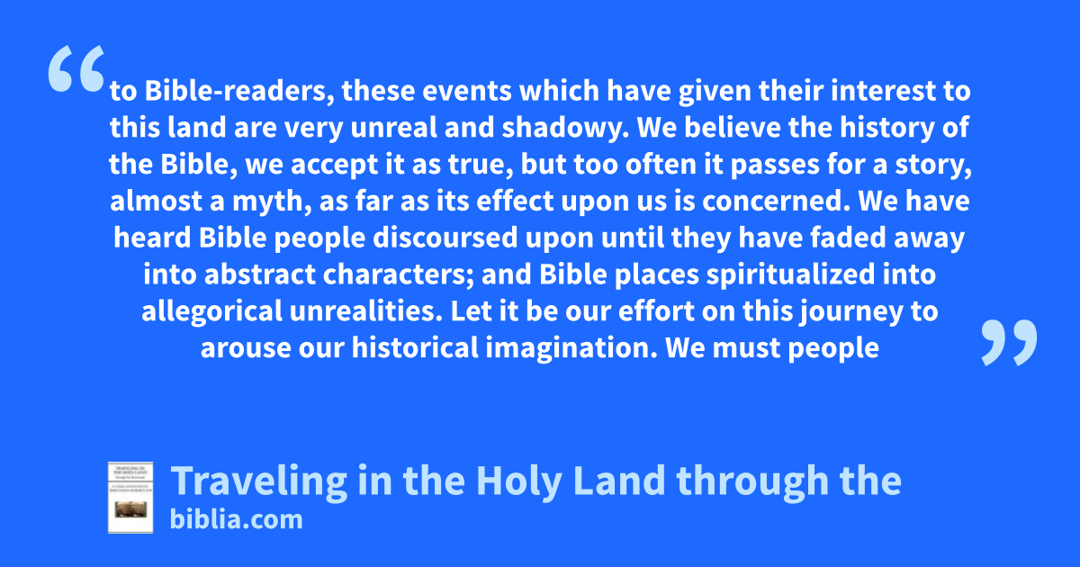 to Bible-readers, these events which have given their interest to this land are very unreal and shadowy. We believe the history of the Bible, we accept it as true, but too often it passes for a story, almost a myth, as far as its effect upon us is concerned. We have heard Bible people discoursed upon until they have faded away into abstract characters; and Bible places spiritualized into allegorical unrealities. Let it be our effort on this journey to arouse our historical imagination. We must people
