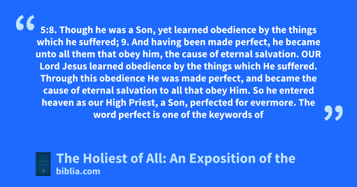 5:8. Though he was a Son, yet learned obedience by the things which he suffered; 9. And having been made perfect, he became unto all them that obey him, the cause of eternal salvation. OUR Lord Jesus learned obedience by the things which He suffered. Through this obedience He was made perfect, and became the cause of eternal salvation to all that obey Him. So he entered heaven as our High Priest, a Son, perfected for evermore. The word perfect is one of the keywords of