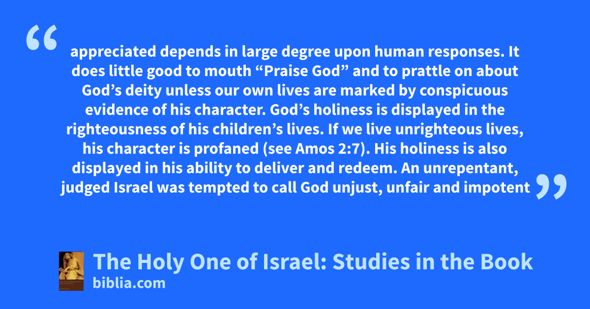 appreciated depends in large degree upon human responses. It does little good to mouth “Praise God” and to prattle on about God’s deity unless our own lives are marked by conspicuous evidence of his character. God’s holiness is displayed in the righteousness of his children’s lives. If we live unrighteous lives, his character is profaned (see Amos 2:7). His holiness is also displayed in his ability to deliver and redeem. An unrepentant, judged Israel was tempted to call God unjust, unfair and impotent