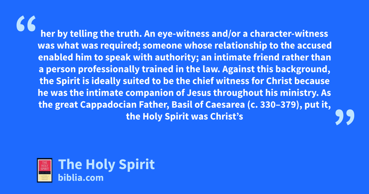 her by telling the truth. An eye-witness and/or a character-witness was what was required; someone whose relationship to the accused enabled him to speak with authority; an intimate friend rather than a person professionally trained in the law. Against this background, the Spirit is ideally suited to be the chief witness for Christ because he was the intimate companion of Jesus throughout his ministry. As the great Cappadocian Father, Basil of Caesarea (c. 330–379), put it, the Holy Spirit was Christ’s