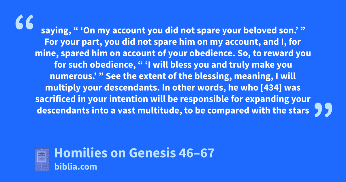 saying, “ ‘On my account you did not spare your beloved son.’ ” For your part, you did not spare him on my account, and I, for mine, spared him on account of your obedience. So, to reward you for such obedience, “ ‘I will bless you and truly make you numerous.’ ” See the extent of the blessing, meaning, I will multiply your descendants. In other words, he who [434] was sacrificed in your intention will be responsible for expanding your descendants into a vast multitude, to be compared with the stars