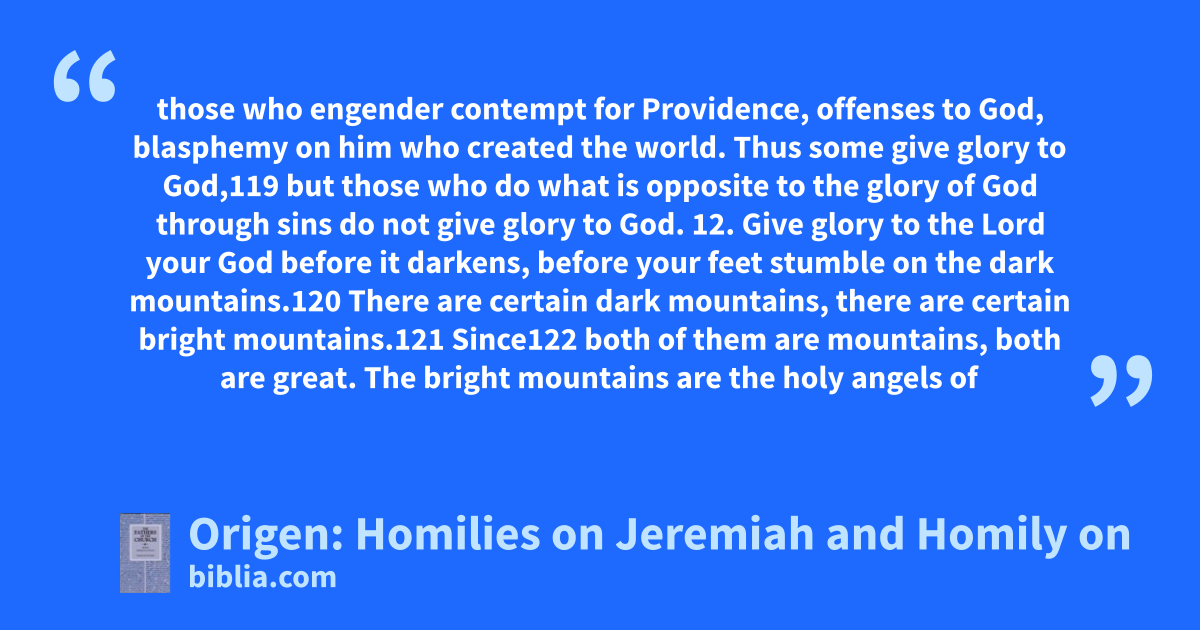 those who engender contempt for Providence, offenses to God, blasphemy on him who created the world. Thus some give glory to God,119 but those who do what is opposite to the glory of God through sins do not give glory to God. 12. Give glory to the Lord your God before it darkens, before your feet stumble on the dark mountains.120 There are certain dark mountains, there are certain bright mountains.121 Since122 both of them are mountains, both are great. The bright mountains are the holy angels of