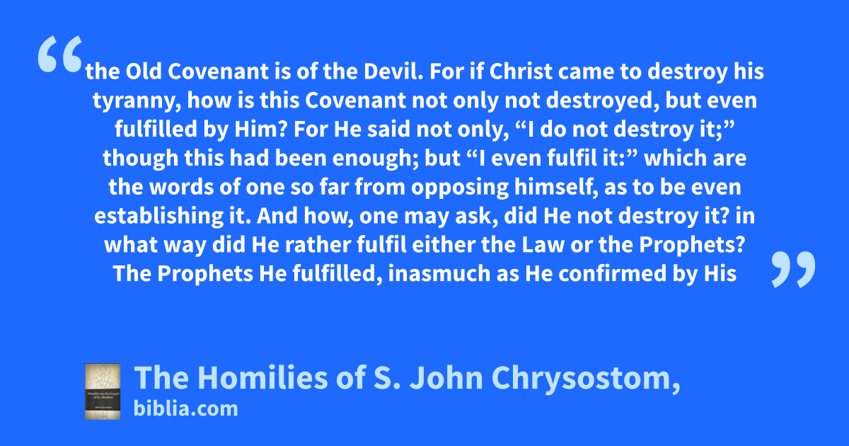 the Old Covenant is of the Devil. For if Christ came to destroy his tyranny, how is this Covenant not only not destroyed, but even fulfilled by Him? For He said not only, “I do not destroy it;” though this had been enough; but “I even fulfil it:” which are the words of one so far from opposing himself, as to be even establishing it. And how, one may ask, did He not destroy it? in what way did He rather fulfil either the Law or the Prophets? The Prophets He fulfilled, inasmuch as He confirmed by His