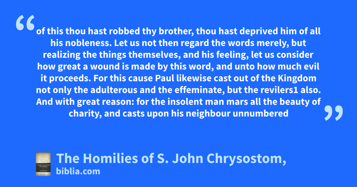 of this thou hast robbed thy brother, thou hast deprived him of all his nobleness. Let us not then regard the words merely, but realizing the things themselves, and his feeling, let us consider how great a wound is made by this word, and unto how much evil it proceeds. For this cause Paul likewise cast out of the Kingdom not only the adulterous and the effeminate, but the revilers1 also. And with great reason: for the insolent man mars all the beauty of charity, and casts upon his neighbour unnumbered