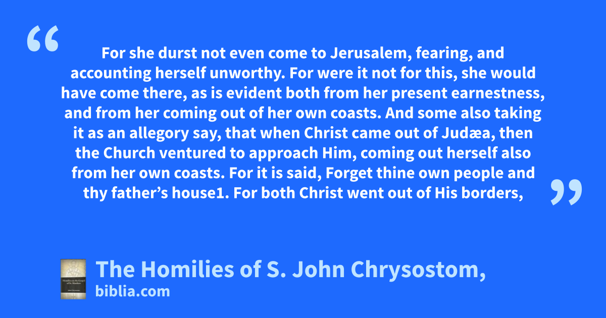 For she durst not even come to Jerusalem, fearing, and accounting herself unworthy. For were it not for this, she would have come there, as is evident both from her present earnestness, and from her coming out of her own coasts. And some also taking it as an allegory say, that when Christ came out of Judæa, then the Church ventured to approach Him, coming out herself also from her own coasts. For it is said, Forget thine own people and thy father’s house1. For both Christ went out of His borders,