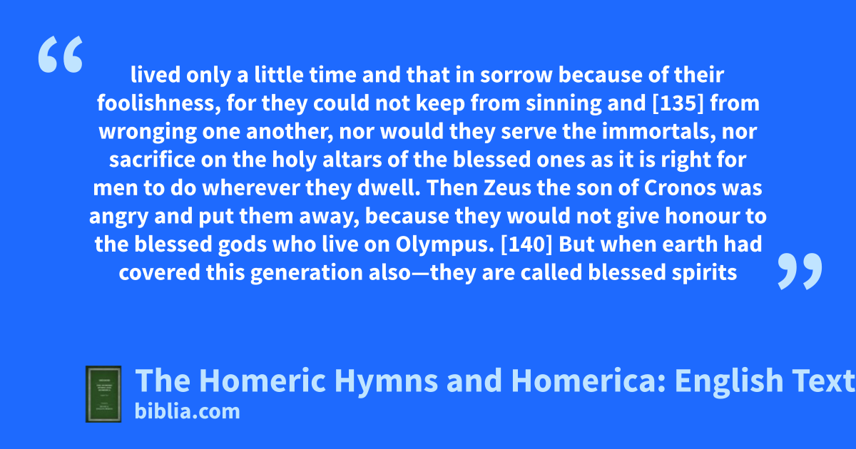 lived only a little time and that in sorrow because of their foolishness, for they could not keep from sinning and [135] from wronging one another, nor would they serve the immortals, nor sacrifice on the holy altars of the blessed ones as it is right for men to do wherever they dwell. Then Zeus the son of Cronos was angry and put them away, because they would not give honour to the blessed gods who live on Olympus. [140] But when earth had covered this generation also—they are called blessed spirits