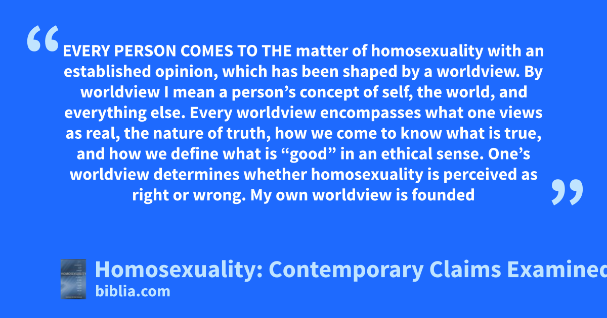 EVERY PERSON COMES TO THE matter of homosexuality with an established opinion, which has been shaped by a worldview. By worldview I mean a person’s concept of self, the world, and everything else. Every worldview encompasses what one views as real, the nature of truth, how we come to know what is true, and how we define what is “good” in an ethical sense. One’s worldview determines whether homosexuality is perceived as right or wrong. My own worldview is founded