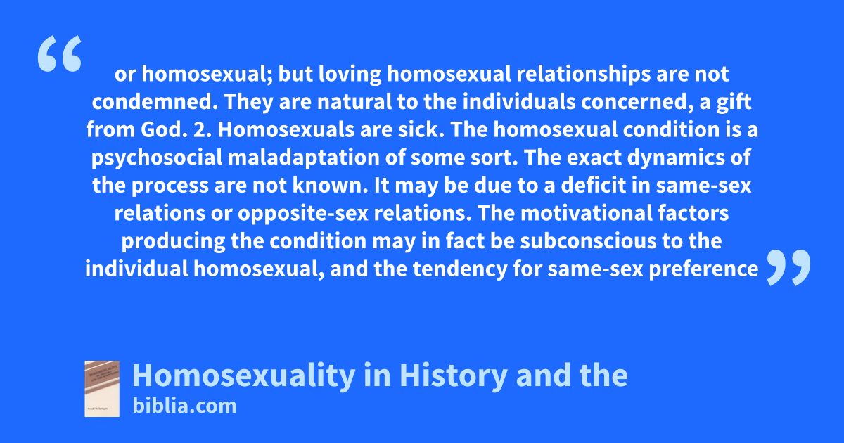 or homosexual; but loving homosexual relationships are not condemned. They are natural to the individuals concerned, a gift from God. 2. Homosexuals are sick. The homosexual condition is a psychosocial maladaptation of some sort. The exact dynamics of the process are not known. It may be due to a deficit in same-sex relations or opposite-sex relations. The motivational factors producing the condition may in fact be subconscious to the individual homosexual, and the tendency for same-sex preference