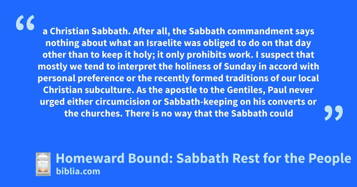 a Christian Sabbath. After all, the Sabbath commandment says nothing about what an Israelite was obliged to do on that day other than to keep it holy; it only prohibits work. I suspect that mostly we tend to interpret the holiness of Sunday in accord with personal preference or the recently formed traditions of our local Christian subculture. As the apostle to the Gentiles, Paul never urged either circumcision or Sabbath-keeping on his converts or the churches. There is no way that the Sabbath could