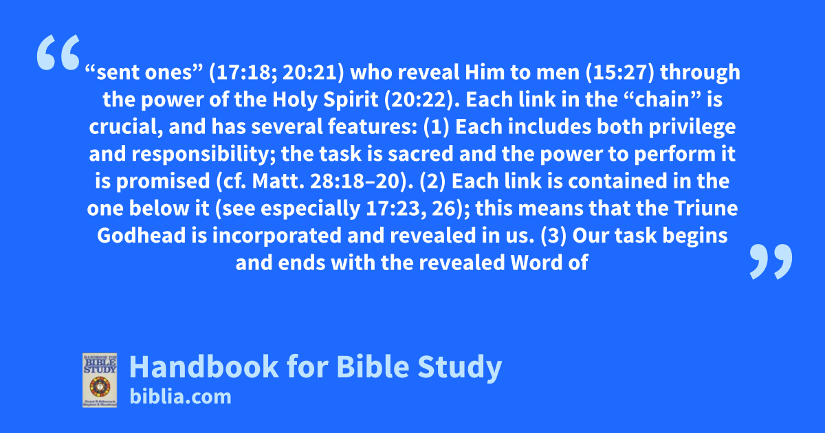 “sent ones” (17:18; 20:21) who reveal Him to men (15:27) through the power of the Holy Spirit (20:22). Each link in the “chain” is crucial, and has several features: (1) Each includes both privilege and responsibility; the task is sacred and the power to perform it is promised (cf. Matt. 28:18–20). (2) Each link is contained in the one below it (see especially 17:23, 26); this means that the Triune Godhead is incorporated and revealed in us. (3) Our task begins and ends with the revealed Word of