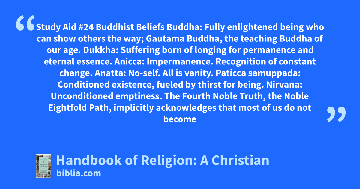 Study Aid #24 Buddhist Beliefs Buddha: Fully enlightened being who can show others the way; Gautama Buddha, the teaching Buddha of our age. Dukkha: Suffering born of longing for permanence and eternal essence. Anicca: Impermanence. Recognition of constant change. Anatta: No-self. All is vanity. Paticca samuppada: Conditioned existence, fueled by thirst for being. Nirvana: Unconditioned emptiness. The Fourth Noble Truth, the Noble Eightfold Path, implicitly acknowledges that most of us do not become