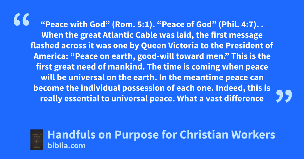 “Peace with God” (Rom. 5:1). “Peace of God” (Phil. 4:7). . When the great Atlantic Cable was laid, the first message flashed across it was one by Queen Victoria to the President of America: “Peace on earth, good-will toward men.” This is the first great need of mankind. The time is coming when peace will be universal on the earth. In the meantime peace can become the individual possession of each one. Indeed, this is really essential to universal peace. What a vast difference