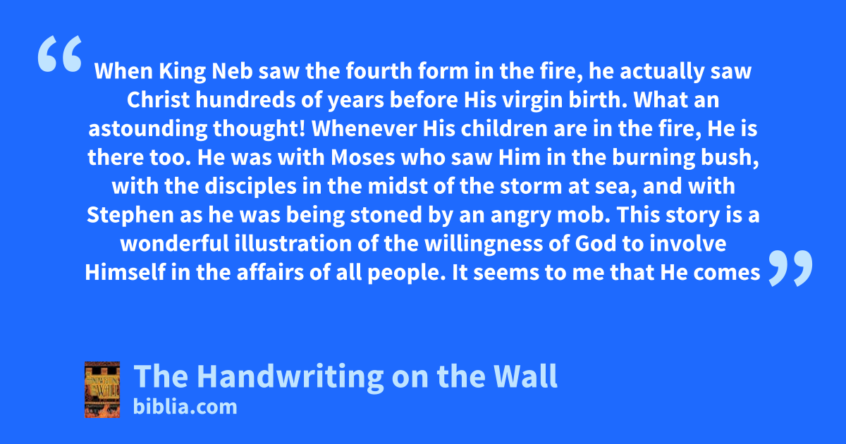 When King Neb saw the fourth form in the fire, he actually saw Christ hundreds of years before His virgin birth. What an astounding thought! Whenever His children are in the fire, He is there too. He was with Moses who saw Him in the burning bush, with the disciples in the midst of the storm at sea, and with Stephen as he was being stoned by an angry mob. This story is a wonderful illustration of the willingness of God to involve Himself in the affairs of all people. It seems to me that He comes