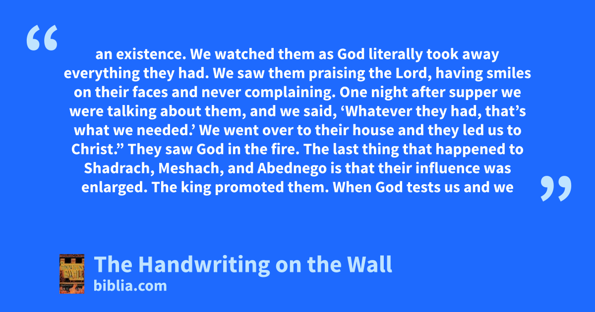 an existence. We watched them as God literally took away everything they had. We saw them praising the Lord, having smiles on their faces and never complaining. One night after supper we were talking about them, and we said, ‘Whatever they had, that’s what we needed.’ We went over to their house and they led us to Christ.” They saw God in the fire. The last thing that happened to Shadrach, Meshach, and Abednego is that their influence was enlarged. The king promoted them. When God tests us and we