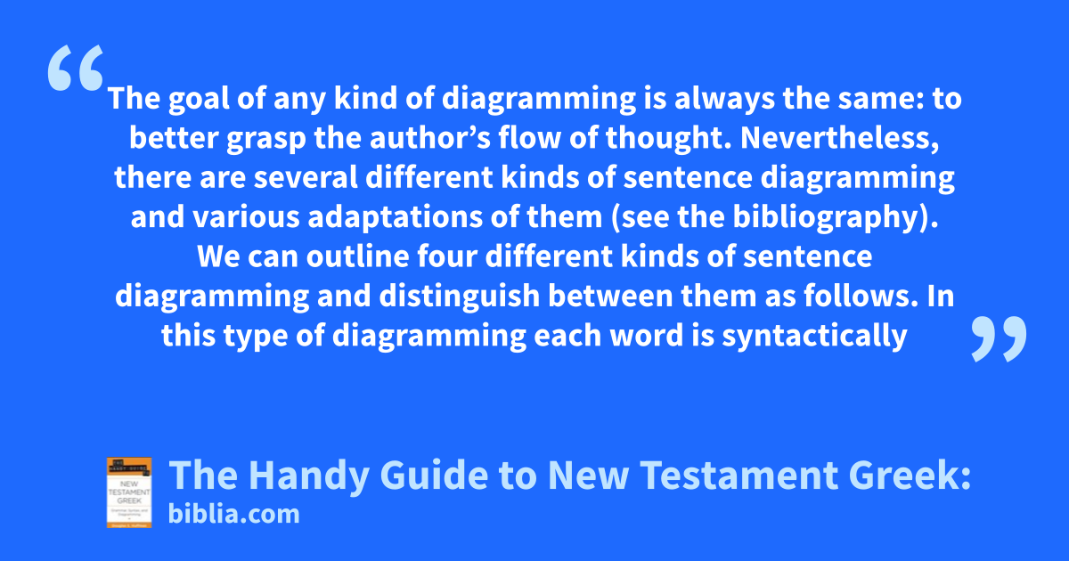The goal of any kind of diagramming is always the same: to better grasp the author’s flow of thought. Nevertheless, there are several different kinds of sentence diagramming and various adaptations of them (see the bibliography). We can outline four different kinds of sentence diagramming and distinguish between them as follows. In this type of diagramming each word is syntactically