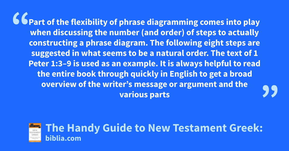 Part of the flexibility of phrase diagramming comes into play when discussing the number (and order) of steps to actually constructing a phrase diagram. The following eight steps are suggested in what seems to be a natural order. The text of 1 Peter 1:3–9 is used as an example. It is always helpful to read the entire book through quickly in English to get a broad overview of the writer’s message or argument and the various parts