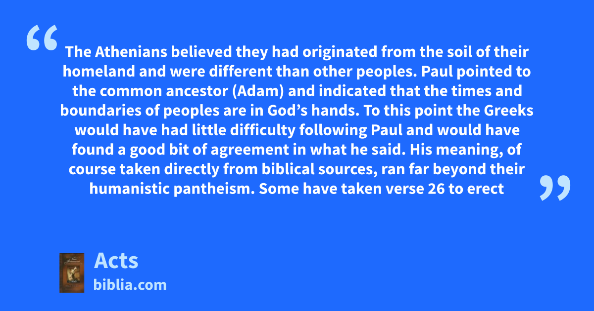 The Athenians believed they had originated from the soil of their homeland and were different than other peoples. Paul pointed to the common ancestor (Adam) and indicated that the times and boundaries of peoples are in God’s hands. To this point the Greeks would have had little difficulty following Paul and would have found a good bit of agreement in what he said. His meaning, of course taken directly from biblical sources, ran far beyond their humanistic pantheism. Some have taken verse 26 to erect