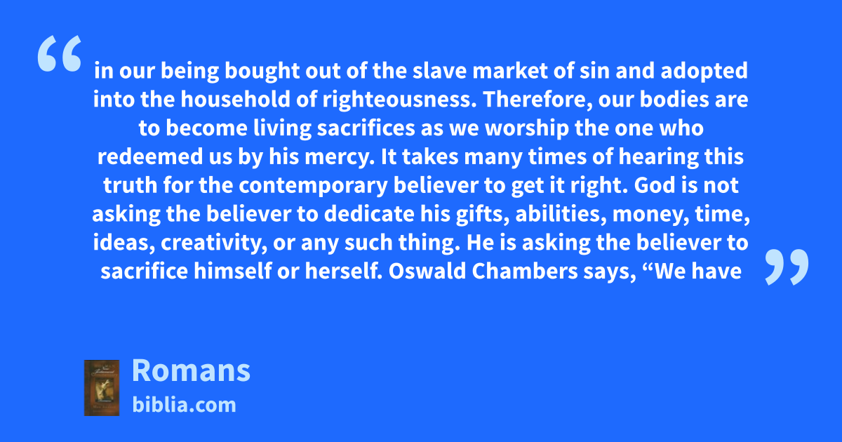 in our being bought out of the slave market of sin and adopted into the household of righteousness. Therefore, our bodies are to become living sacrifices as we worship the one who redeemed us by his mercy. It takes many times of hearing this truth for the contemporary believer to get it right. God is not asking the believer to dedicate his gifts, abilities, money, time, ideas, creativity, or any such thing. He is asking the believer to sacrifice himself or herself. Oswald Chambers says, “We have