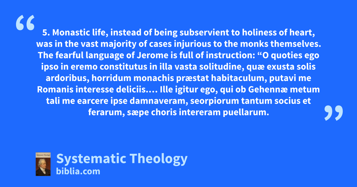 5. Monastic life, instead of being subservient to holiness of heart, was in the vast majority of cases injurious to the monks themselves. The fearful language of Jerome is full of instruction: “O quoties ego ipso in eremo constitutus in illa vasta solitudine, quæ exusta solis ardoribus, horridum monachis præstat habitaculum, putavi me Romanis interesse deliciis.… Ille igitur ego, qui ob Gehennæ metum tali me earcere ipse damnaveram, seorpiorum tantum socius et ferarum, sæpe choris intereram puellarum.