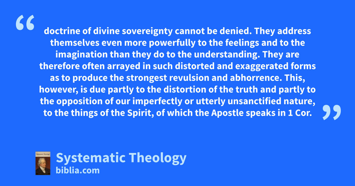 doctrine of divine sovereignty cannot be denied. They address themselves even more powerfully to the feelings and to the imagination than they do to the understanding. They are therefore often arrayed in such distorted and exaggerated forms as to produce the strongest revulsion and abhorrence. This, however, is due partly to the distortion of the truth and partly to the opposition of our imperfectly or utterly unsanctified nature, to the things of the Spirit, of which the Apostle speaks in 1 Cor.